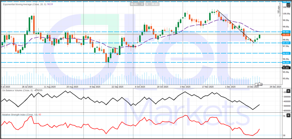 شاخص دلار (DXY) نزدیک ۹۸.۳۶ معامله میشود و پس از فروش تندِ اواسط دسامبر و یک بازگشت ملایم، همچنان زیر EMA بیستروزه (~۹۸.۵۹) قرار دارد. نمودار نشانههایی از ترمیم اولیه دارد: قیمت از خط روند نزولی کوتاهمدت عبور کرده و RSI در حال بهبود است (حدود ۴۳)، اما مومنتوم هنوز زیر خط ۵۰ است و مشارکت نیز فقط تا حدی تأیید میشود؛ چون OBV همچنان فاصله زیادی با اوجهای قبلی دارد. این وضعیت، سوگیری را خنثی با تمایل محتاطانه صعودی نگه میدارد—اما فقط در صورتی که شاخص بتواند یک کلوز روزانه تمیز بالای ۹۸.۶ ثبت کند و سپس تا ۹۹.۰–۹۹.۳ ادامه بدهد. تا قبل از آن، حرکت بیشتر یک جهش اصلاحی است تا یک بازگشت روندِ تأییدشده. در سمت پایین، ۹۷.۷۳ حمایت «باید حفظ شود» است؛ شکست آن توجه را به ۹۶.۹۲ و سپس ۹۶.۲۲–۹۵.۸۱ میبرد. بالای ۹۹.۳، مقاومتهای بزرگتر نزدیک ۱۰۰.۰ و ۱۰۰.۹ قرار دارند.