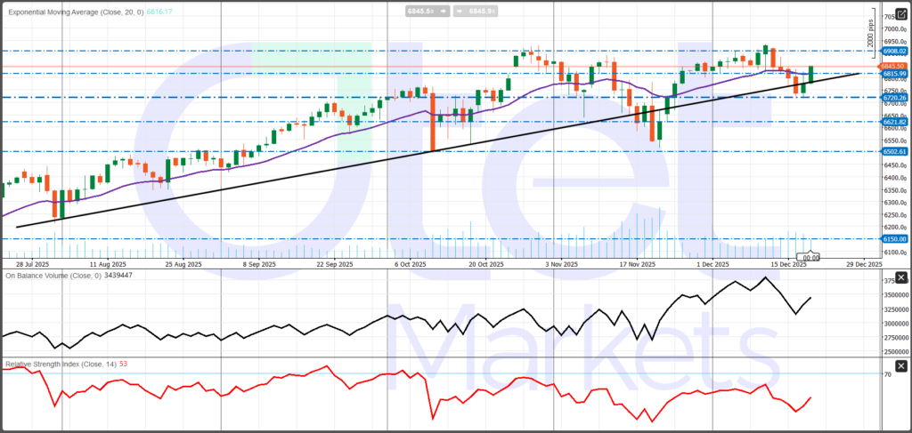 شاخص S&P 500 نزدیک ۶۸۴۵.۵ معامله میشود، دوباره بالای EMA بیستروزه (~۶۸۱۶.۲) قرار گرفته و نزدیک یک خط روند صعودی حفظ شده است؛ موضوعی که ساختار کلی را سازنده نگه میدارد. پس از اصلاح اواسط دسامبر، مومنتوم بهتر شده است: RSI حدود ۵۳ است و یک پسزمینه خنثی تا مثبت را نشان میدهد بدون اینکه حالت اشباع خرید داشته باشد. با این حال، شاخص هنوز زیر یک ناحیه عرضه مشخص در بالا سقفگیری میشود؛ بنابراین چیدمان فعلی بهتر است «تراکم/فشردگی در قالب یک تثبیت شرایط» توصیف شود—منطقه تصمیم، ادامه روند صعودی یا شکستِ ناکام خواهد بود.