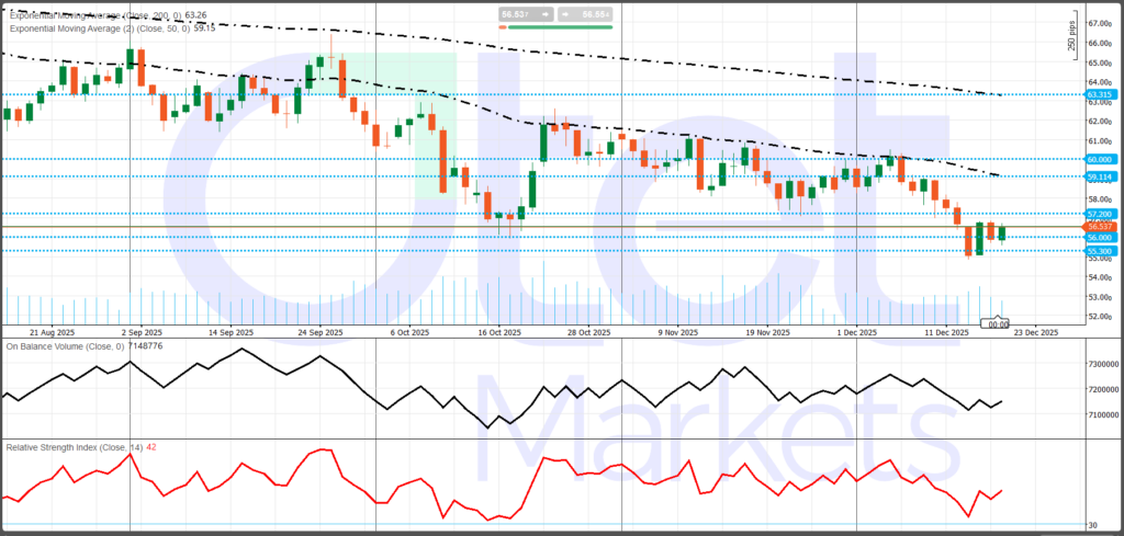 از نظر تکنیکال، دو هفته اخیر یک باند عملیاتی حدود ۵۴.۹ تا ۵۸.۰ دلار را تعریف میکند. مقاومت از ۵۷.۲۰–۵۷.۷۵ شروع میشود و سقف بزرگتر ۵۸.۸۰–۶۰.۰۰ است. حمایت در ۵۵.۰۰–۵۵.۳۰ خط دفاعی کلیدی است و ۵۴.۸۰–۵۵.۰۰ ناحیه ماشه نزولی محسوب میشود.
